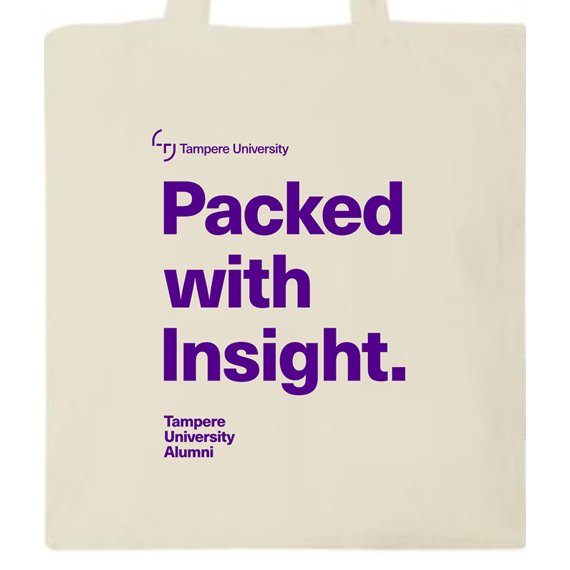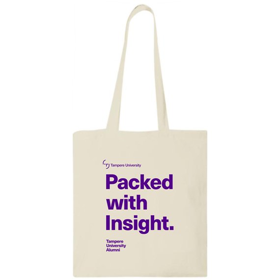 Tämä kassi on tukeva, pitkäaikainen ja sopiva myös painaville tavaroille. 30 cm:n pituisten olkakahvojen ansiosta tätä kassia on helppo kantaa mukana. Valmistettu Intiassa ja OEKO-Tex-sertifioitu. Kestää jopa 5 kg:n painon. Puuvillan tiheys 140 g/m². Tampereen yliopiston "Packed with insight" -painatus.