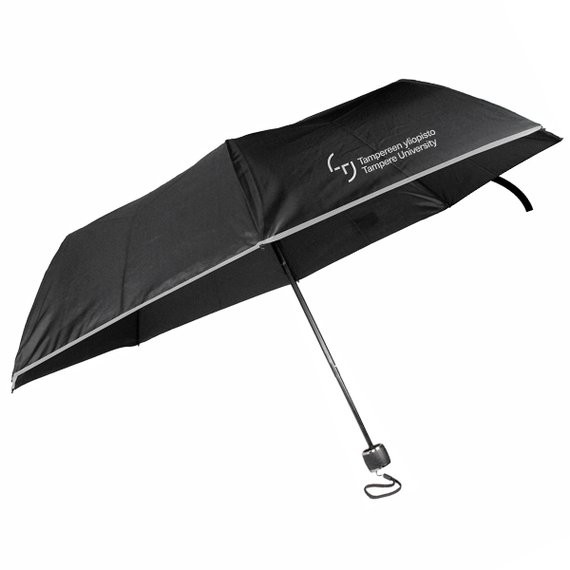 Varaudu muuttuviin sääolosuhteisiin kestävällä ja pieneen tilaan taittuvalla sateenvarjolla. Varjon reunaa kiertää heijastava nauha, joka takaa näkyvyytesi pimeässä. Hopeanväriset yksityiskohdat viimeistelevät varjon. Koko 21". Varjo sisältää pienen säilytyspussin. Heijastava yliopiston silkkisiirtokuva.